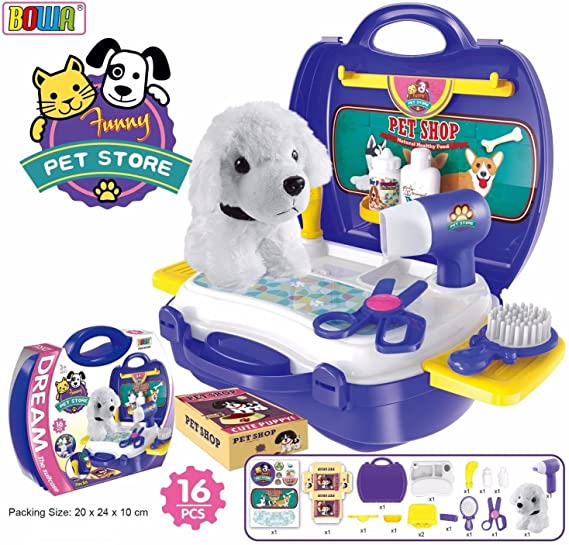 • Setul de joaca include 16 piese de plus pentru catelusi si instrumente de ingrijire a animalelor de companie